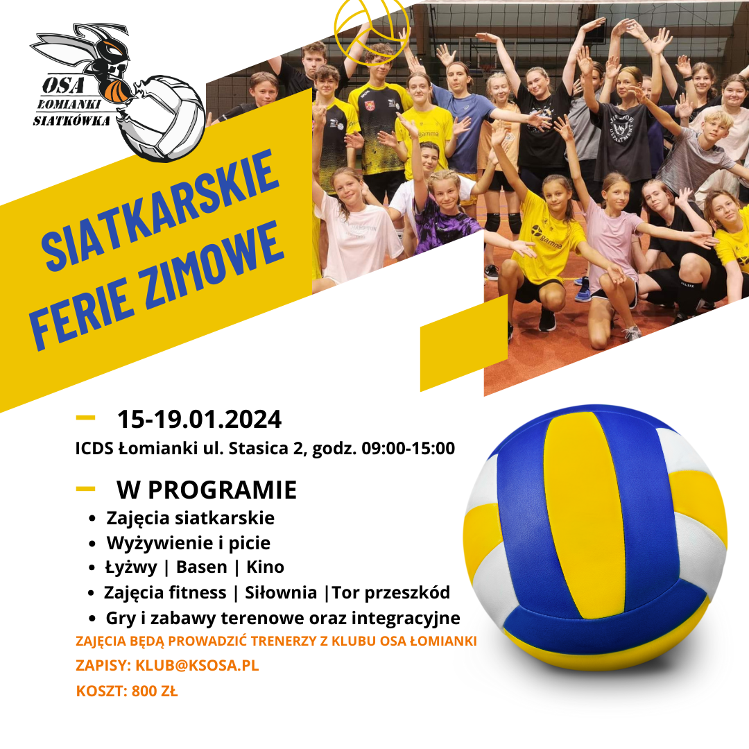 Informujemy, że w trakcie ferii zimowych 15-28.01.2024 zajęcia Osa Łomianki Siatkówka i zabawy sportowe są odwołane. Przypominamy o możliwości zapisania się na zimowy wyjazd dla